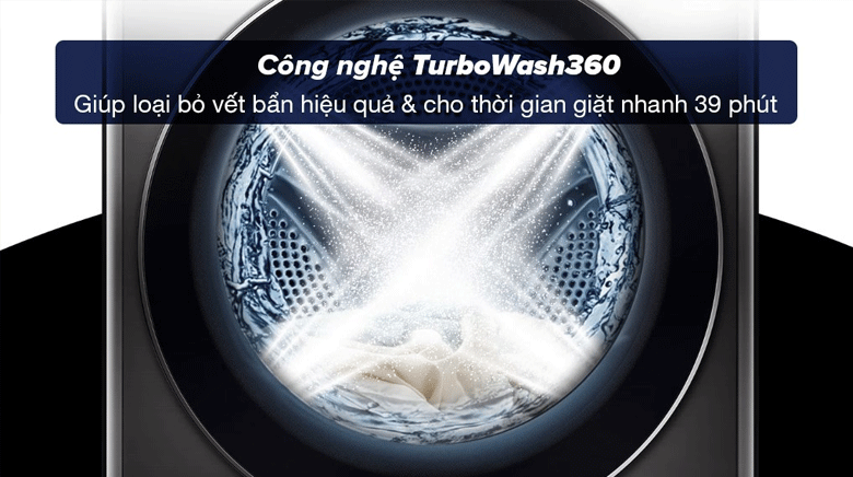 - Công nghệ TurboWash360: Trang bị gấp đôi số vòi phun (4 vòi) so với công nghệ TurboWash, tạo ra tia nước mạnh mẽ, làm tăng tốc độ thẩm mấu nước và chất giặt tẩy vào quần áo, giúp loại bỏ vết bẩn nhanh chóng (khoảng 39 phút).